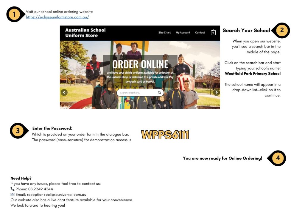 Due to the closure of our P&C Uniform Shop, our new uniform supplier will be Eclipse Universal. Uniforms can be purchased online or directly from their store in Malaga. Online orders will be delivered to the school for collection.